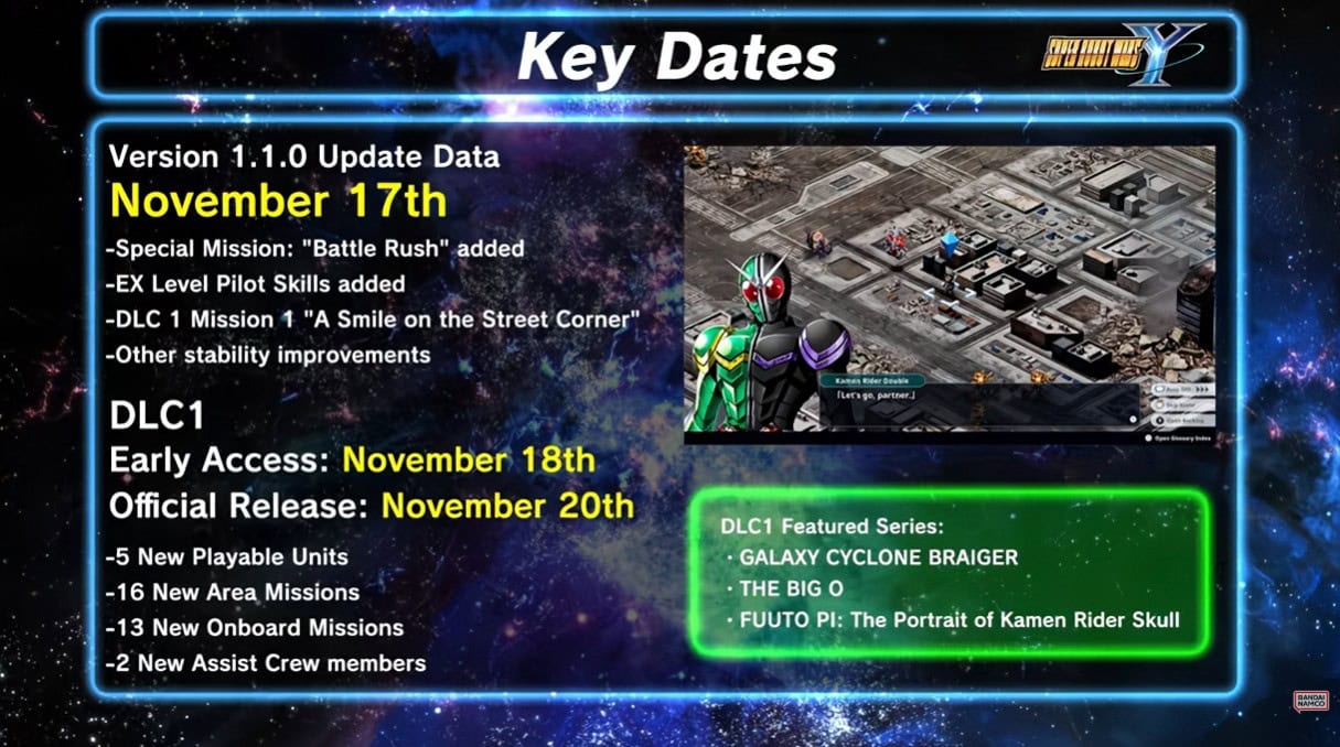 Super Robot Wars Y is out for the PlayStation 4, PlayStation 5, Nintendo Switch, and PC via Steam. Early Access to the 1st DLC set of SRW Y will be available on November 19, 2025 for those purchased the season pass set. Those who purchased the 1st DLC without the season pass will be able to acess it on November 21, 2025.
